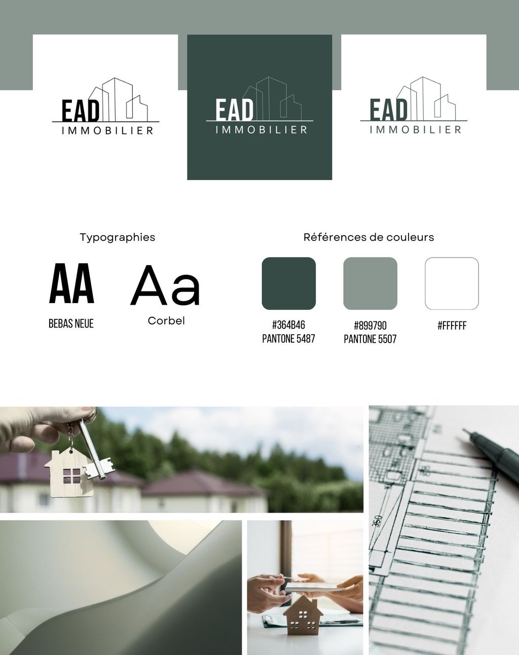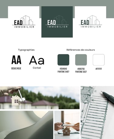 Pour accompagner le lancement du marchand de biens EAD Immobilier, j’ai conçu une identité visuelle moderne et épurée, structurée autour de lignes graphiques rappelant l’univers de l’immobilier et de l’architecture. Le choix d'un vert eucalyptus soutenu apporte une touche à la fois professionnelle, contemporaine et rassurante, en cohérence avec le positionnement de l’entreprise.